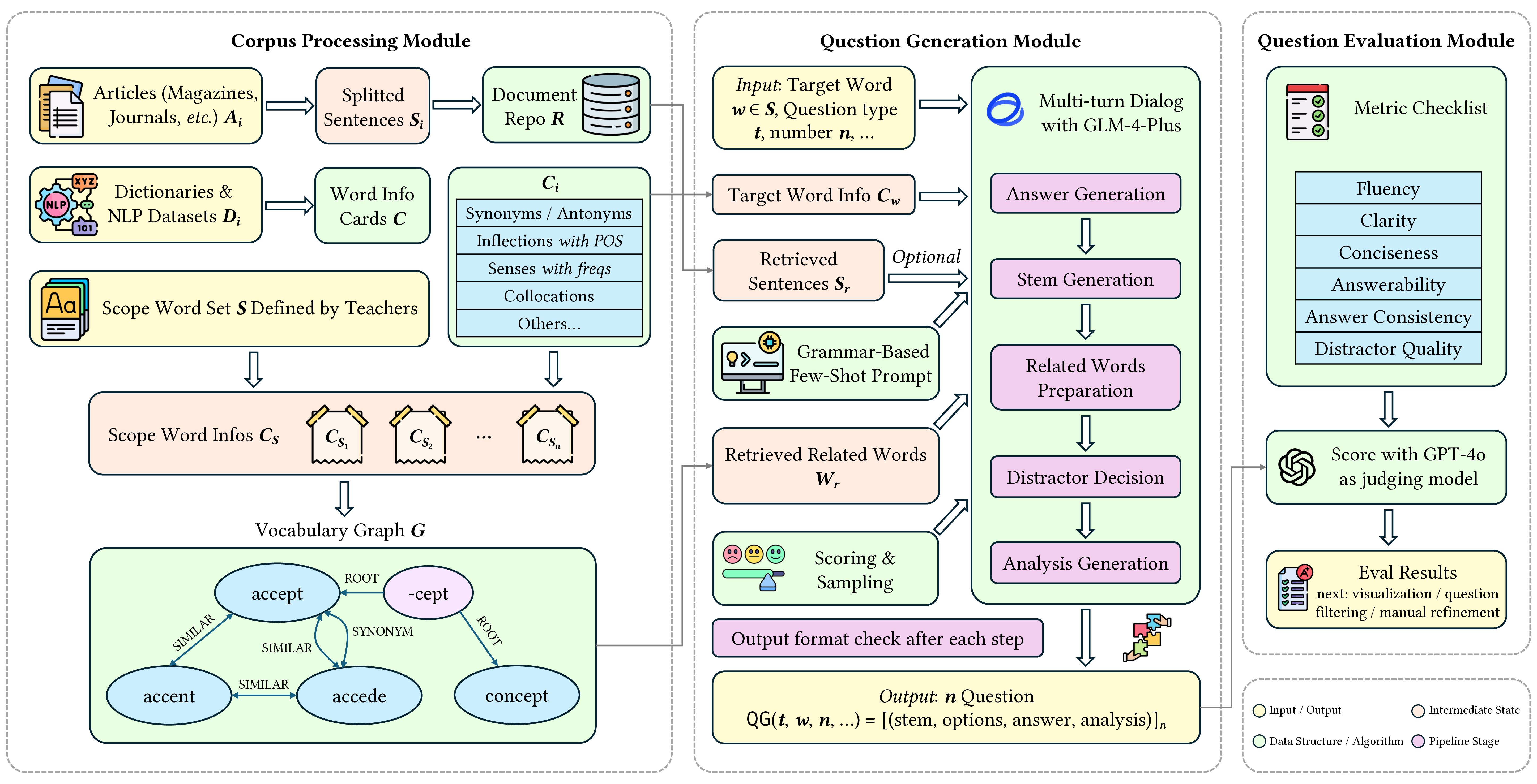 Designing effective English vocabulary question generation tools demands a shift from labor-intensive content creation to large language model (LLM) automation that can adapt to varied educational contexts. Current approaches tend to offer a limited variety of question types, which restricts their practical application in real classroom settings. To better meet the demands of English teaching institutions, we present